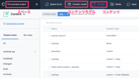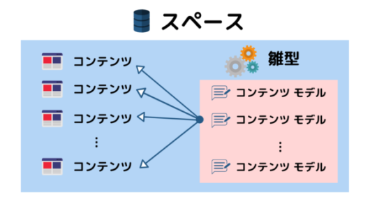 スペースでコンテンツとコンテンツモデルを管理。コンテンツはテンプレートとなるコンテンツモデルから作り出されます。フロント側でAPIを使えば、コンテンツの情報を取得可能です。