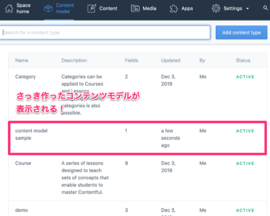すると、こんな先ほど作ったコンテンツモデルがリストに反映されます!