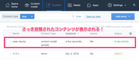 続いて、新規作成したコンテンツモデルで、コンテンツを投稿していきます。
