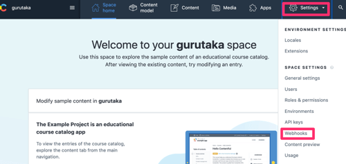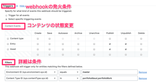 すると、Contentful Webhookが作成されるので、最後にContentful Webhookが発火する条件を設定していきます