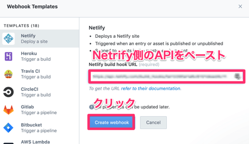 そして、Build hooksで作成したAPIをペーストし、「Create webhook」をクリック!