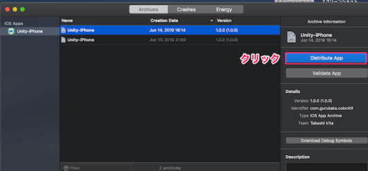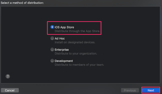 「Distribute App」をクリックし次に進みましょう。その後、「iOS App Store」を選択し、次に進んでください。基本的にデフォルト設定で「Next」押せば大丈夫です!