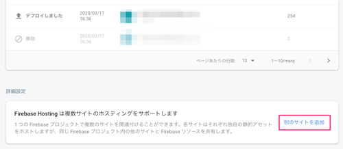 FirebaseのHostingの管理の1番下にある詳細設定から、別サイトを追加しましょう。
