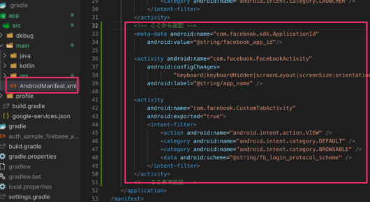 その後に、your project/android/app/src/main/AndroidManifest.xmlに、以下を追記してください。