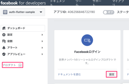 まずFacebookログインの設定ボタンを押します。すると、プロダクトに「Faecbookログイン」が追加されます。