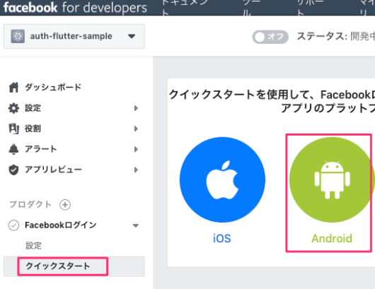 まずは「Facebookログイン」>「クイックスタート」>「Android」をクリック!