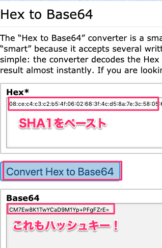 以下のサイトでBase64型に戻したキーもハッシュキーです。同じかどうか、ぜひダブルチェックしてみてください!