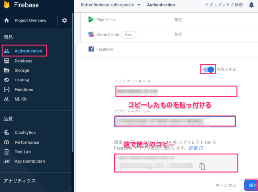 その後に、FirebaseのFacebook Authの設定にはりつければOK!