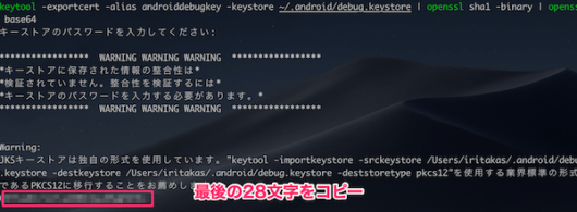 $ keytool -exportcert -alias androiddebugkey -keystore ~/.android/debug.keystore | openssl sha1 -binary | openssl base64