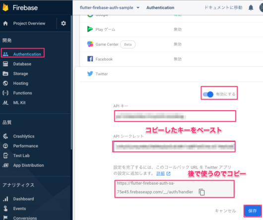 その後に、FirebaseのTwitter Authの設定にはりつければOK!