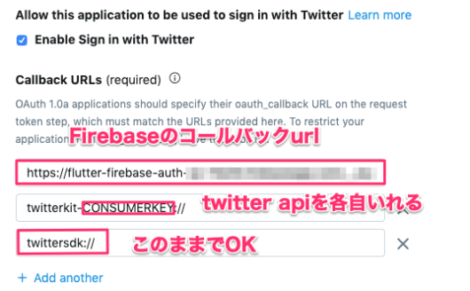 まずSign in with Twitterの項目にチェックします。そして、Callback URLに以下3つを入力してください。