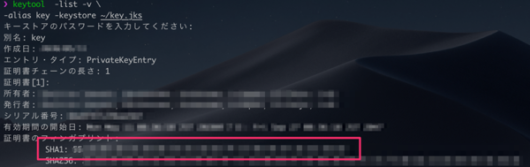 登録したパスワードを入力すると、こんな感じでSHA-1を取得できます。