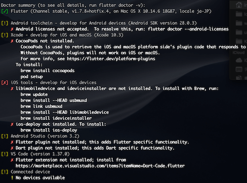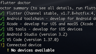 最後にもう一度、$ flutter doctorでチェックして、問題なければセットアップ完了です!