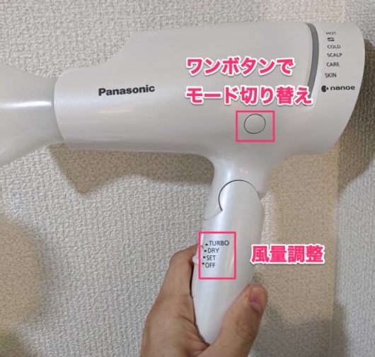 ナノケアのドライヤーはワンボタンで様々なモードに変更できるため、操作が超簡単です。また重量も重すぎないため、じっくり髪を乾かしても、腕が疲れません!