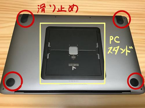 PCのスタンドと平行になる小さなマットシールも付属でついてくるので、スタンドを使用しないで、ノートPCを使ってもガタつきません。