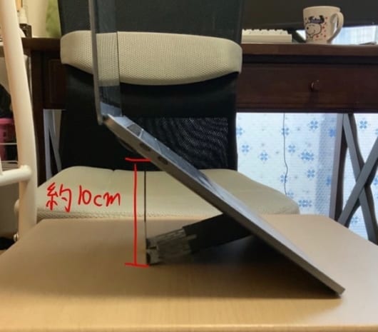 ただし、スタンドをMAXまで上げると、タイピングでPCをが後ろに倒れてしまうので、調整が必要です。
