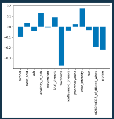 ここからflavonoids(フラボノイドという成分)が大きいと予測値に負の影響を与え、color intensity(濃淡)が大きいと、予測値に正に影響を及ぼすことがわかりす!
