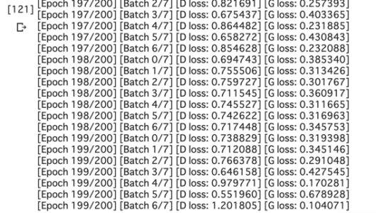 print("[Epoch %d/%d] [Batch %d/%d] [D loss: %f] [G loss: %f]"