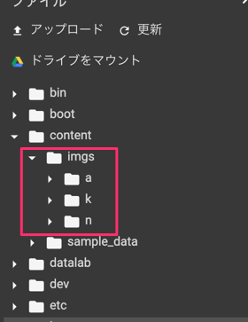 ここは各々のデータをアップロードして下さい。以下のコードは、imgsフォルダ内のデータを使っていきます。