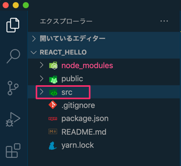 プロジェクト内には様々なフォルダがあり、`src` フォルダに React のコードファイルが格納されています。