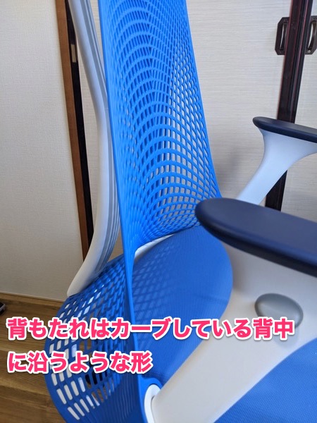 セイルチェアの背もたれは、腰の負担が減るような構造になっています!ヘルニア持ちで過去に腰痛に悩まされた私は、イスの背もたれには敏感なんですが、セイルチェアの背もたれにはニッコリせざるをえません。笑