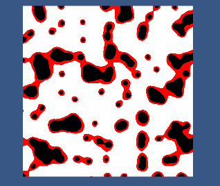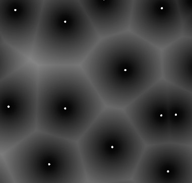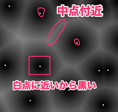 そして、ある2つの白点との中点は最も距離が離れるため、白で区切られたような絵になります。