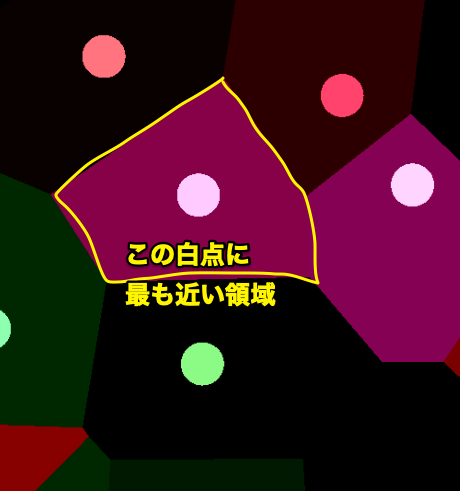 最も近い白点の座標に基づいて色を出力すればボロノイ図が完成です!