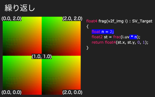 float2 st = i.uv; st *= _SquareNum; //格子状の1辺のマス目数 float2 ist = floor(st);//整数 float2 fst = frac(st);//小数点以下