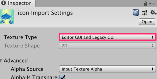 このとき、アイコンのテクスチャ設定をTexture Type > Editor GUI and Legacy GUIにすると、ぼやけないので必ずやっておきましょう!