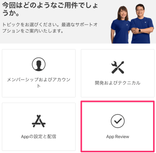 お問い合わせ場所はApple Developer>お問い合わせ>App Reviewです。