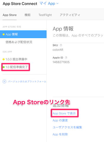 通過連絡がきて時間が経つと、ステータスが配信準備完了に変わります。ただし、すぐにはApp Storeのリンクは有効にならないので注意しましょう!
