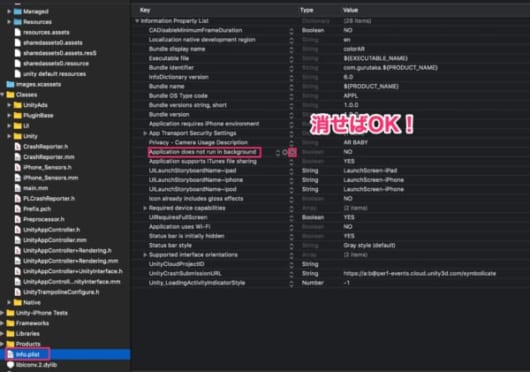 ファイル「info.plist」→「Application dose not run in background」を選択し、マイナスボタンをクリックすれば対応できます。