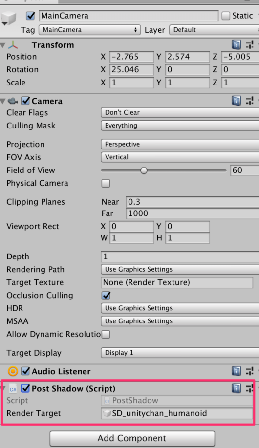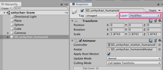 ここではユニティちゃんに、Layer=PostEffectとしています。