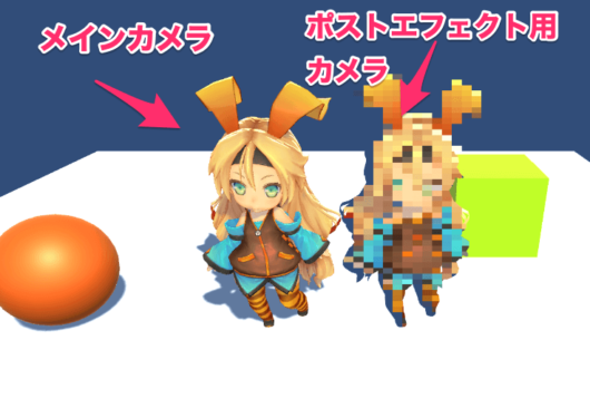 超ざっくりまとめると、ポストエフェクトでモザイクをかけます。特定のオブジェクト限定にするため、専用のカメラを用意。最後に良い感じに合成されて、完成!って感じです。