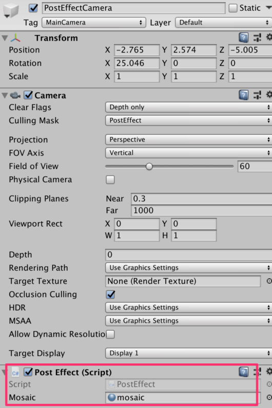 シェーダーが完成できたら、ポストエフェクト用カメラにアタッチしましょう!
