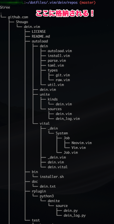 プラグインのインストール先は、~/.vim/dein/repos以下になります。