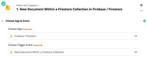 - Choose Trigger Event:New Document Within a Firestore Collection